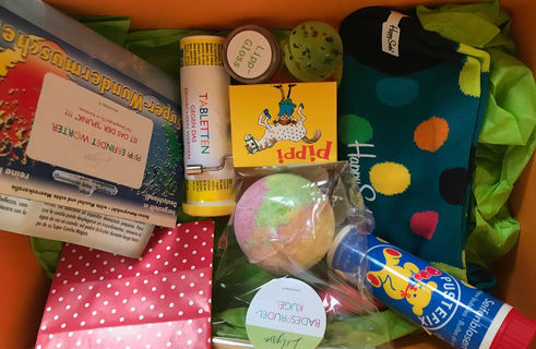 Tupfen-Socken, Badesprudelkugel, farbig-glitzerndes Lippgloss, Seifenblötterli, Tabletten gegen das Erwachsen werden, Gumpibäueli, Super-Wundermuschel und eine Musikdose, die dich sofort in Pippi-Stimmung versetzt